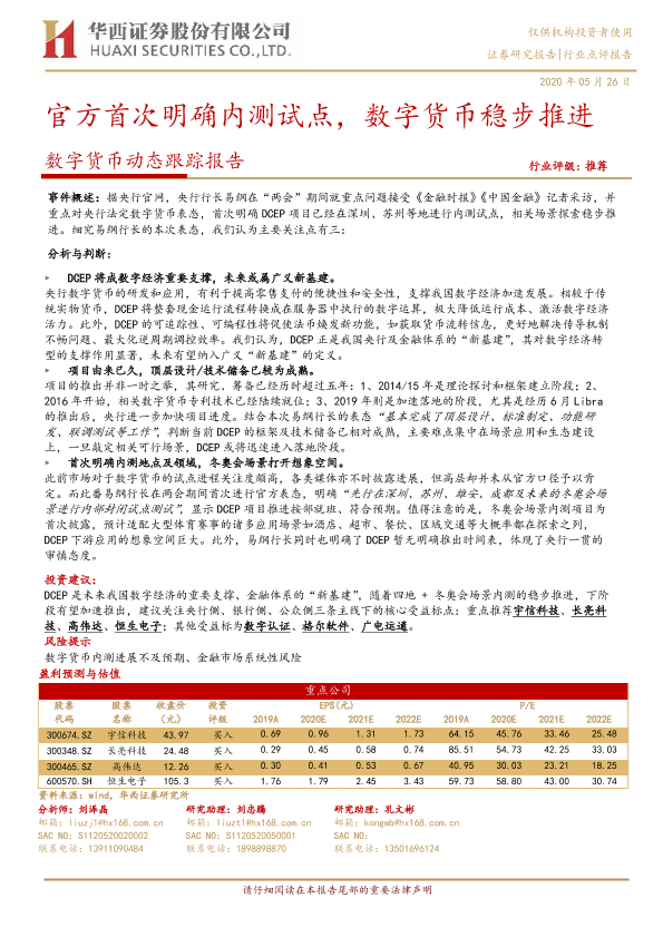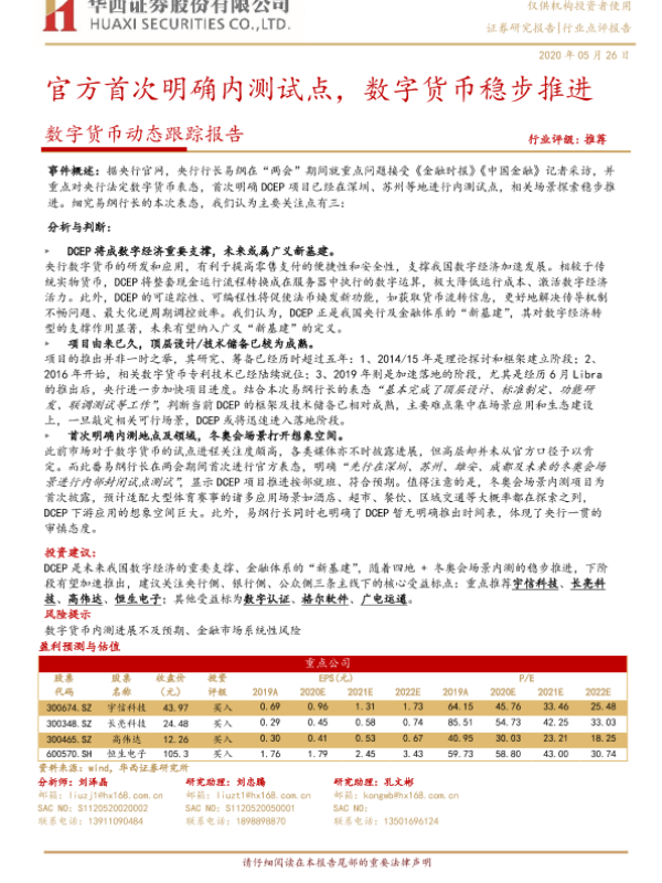 【华西证券】【20200526】20200526-华西证券-数字货币动态跟踪报告:官方首次明确内测试点,数字货币稳步推进-5页