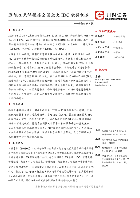 【川财证券】【20200528】科技行业日报:腾讯在天津投建全国最大IDC数据机房-3页