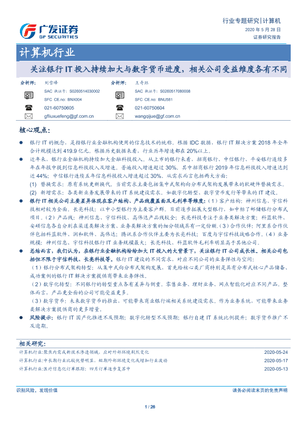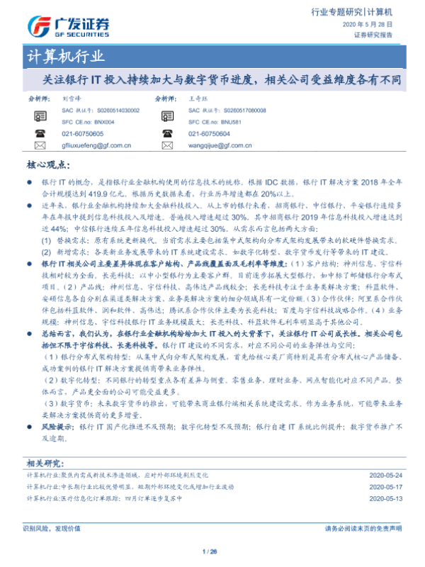 【广发证券】【20200528】计算机行业:关注银行IT投入持续加大与数字货币进度,相关公司受益维度各有不同-26页