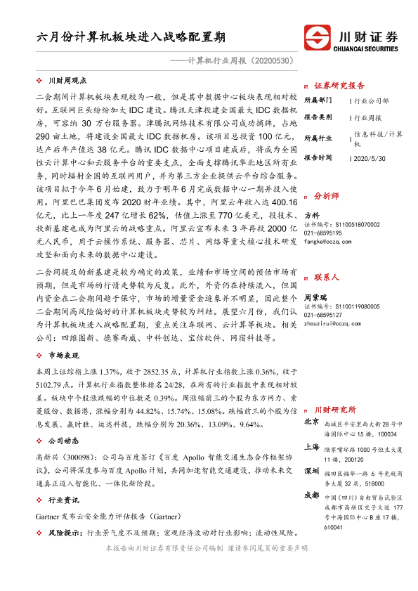 【川财证券】【20200530】20200530-川财证券-计算机行业周报:六月份计算机板块进入战略配置期-10页