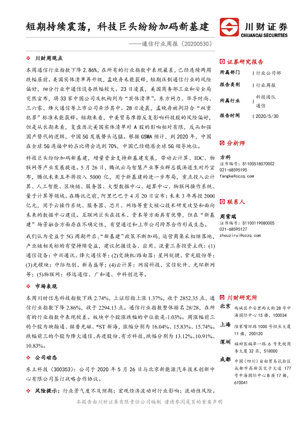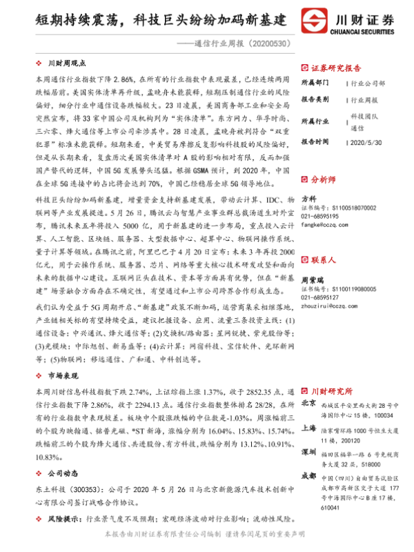 【川财证券】【20200530】通信行业周报:短期持续震荡,科技巨头纷纷加码新基建-10页