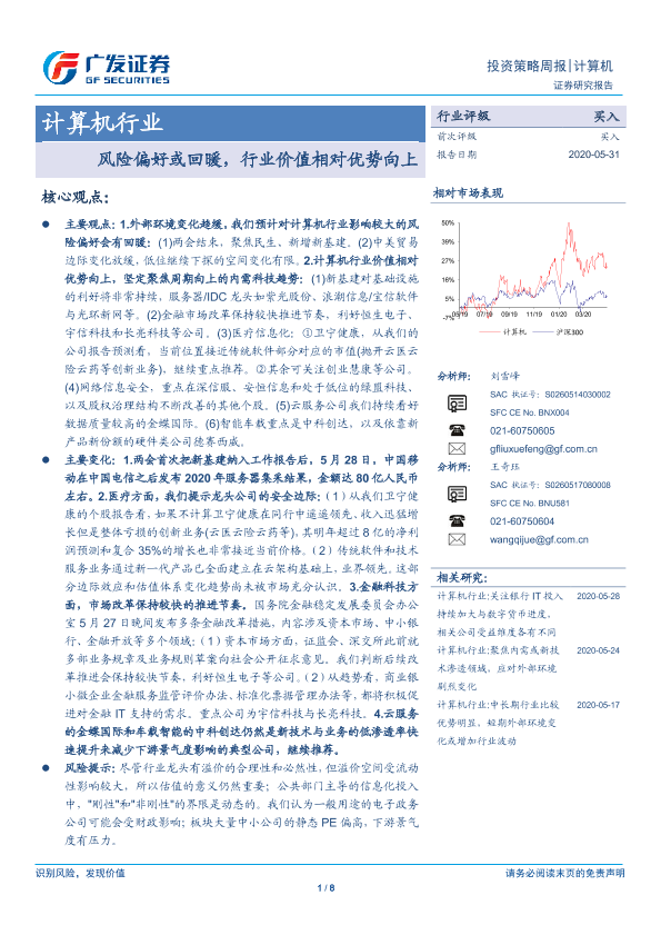 【广发证券】【20200531】计算机行业:风险偏好或回暖,行业价值相对优势向上-8页