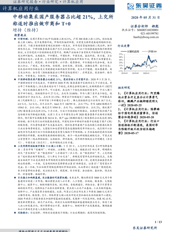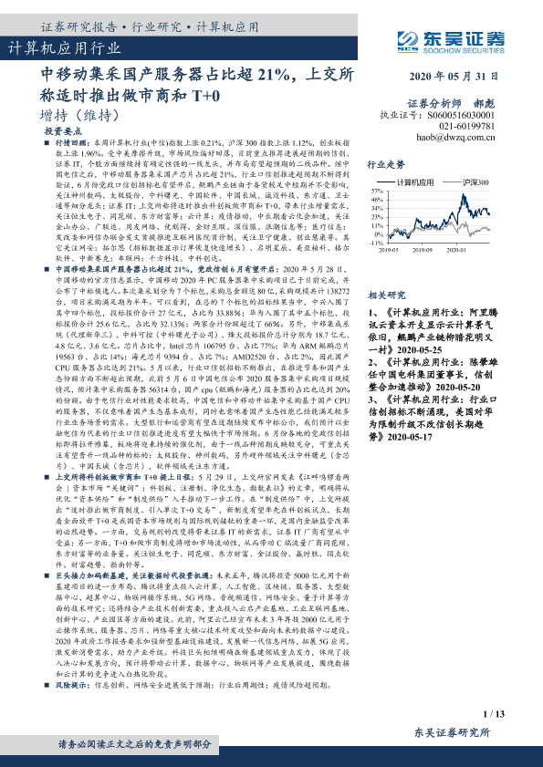 【东吴证券】【20200531】计算机应用行业:中移动集采国产服务器占比超21%,上交所称适时推出做市商和T+0-13页