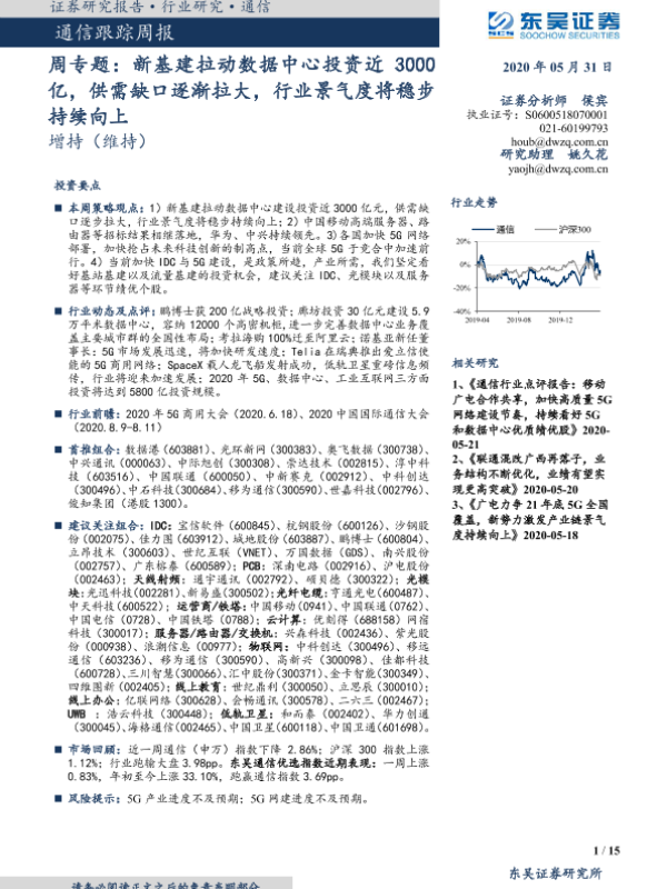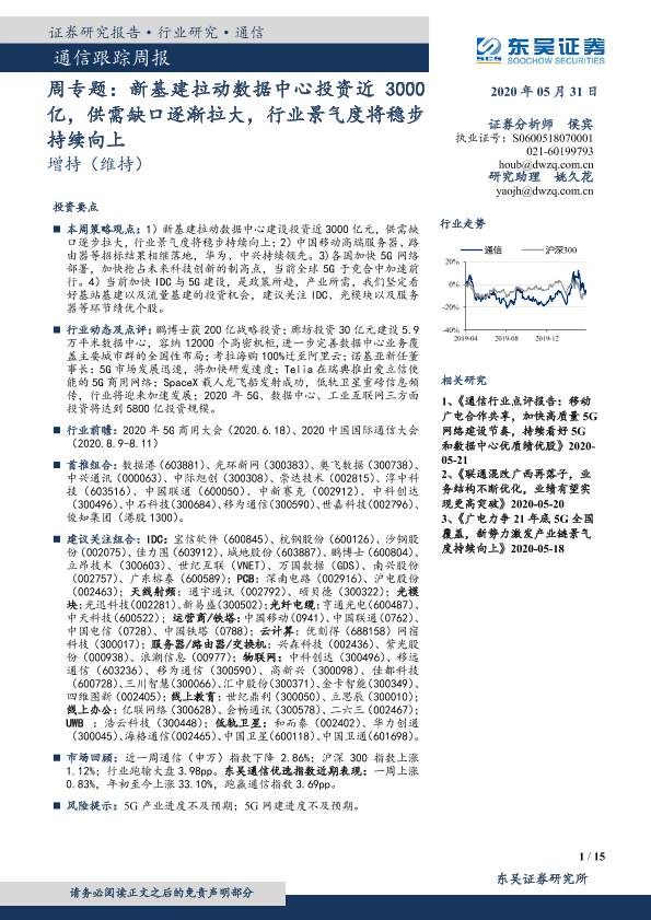 【东吴证券】【20200531】通信跟踪周报:新基建拉动数据中心投资近3000亿,供需缺口逐渐拉大,行业景气度将稳步持续向上-15页