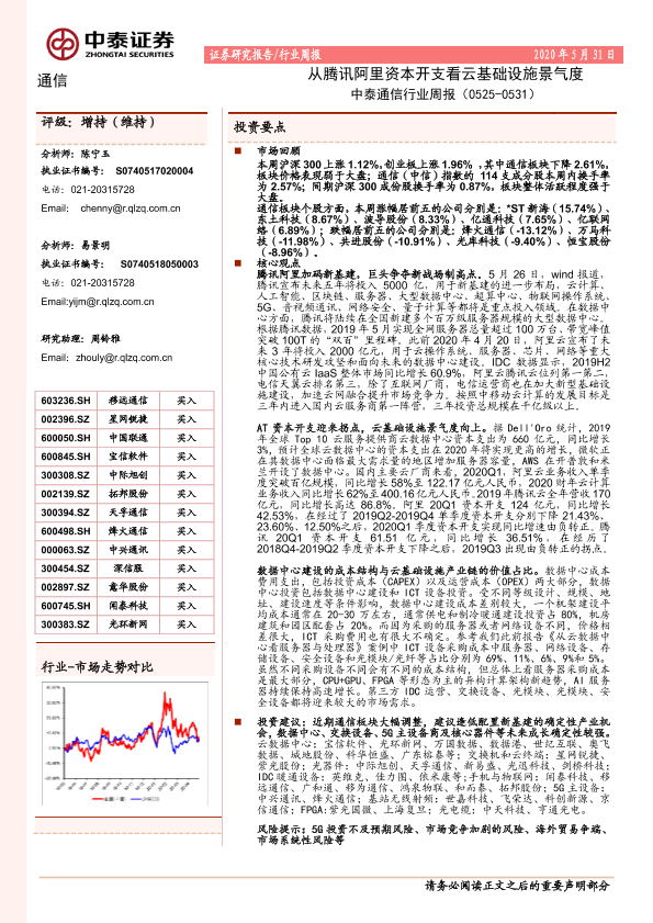 【中泰证券】【20200531】中泰通信行业周报:从腾讯阿里资本开支看云基础设施景气度-14页