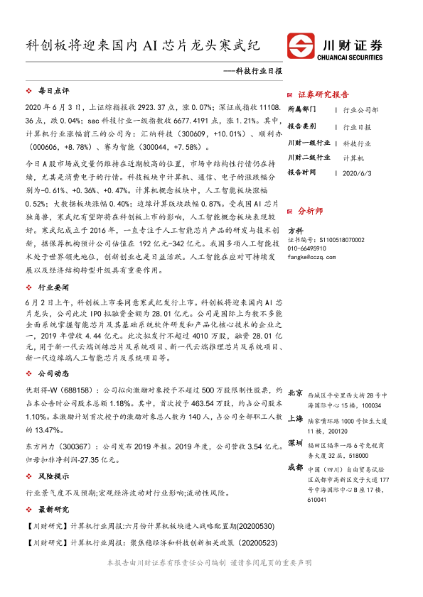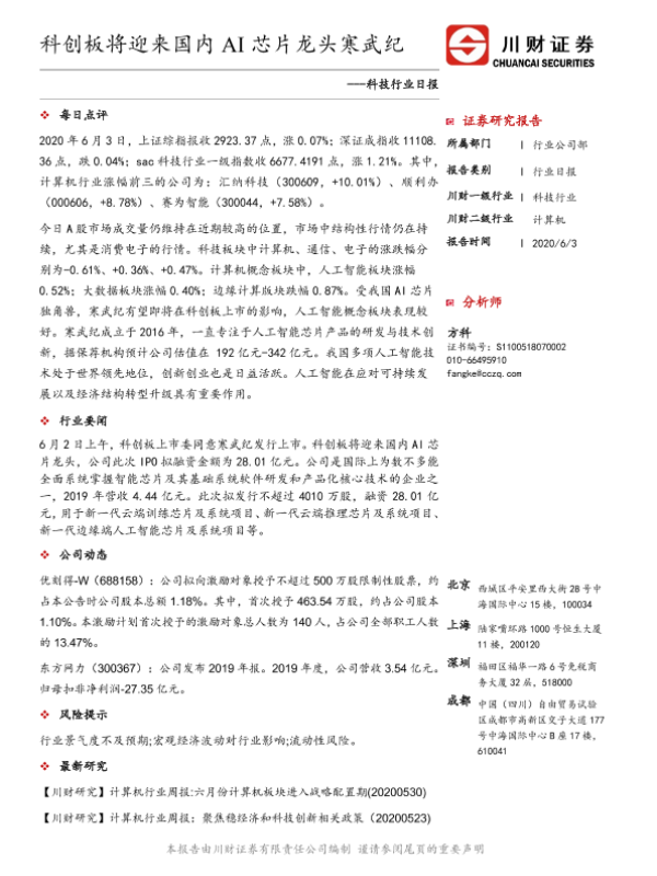 【川财证券】【20200603】科技行业日报:科创板将迎来国内 AI芯片龙头寒武纪-3页