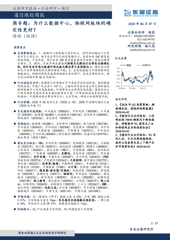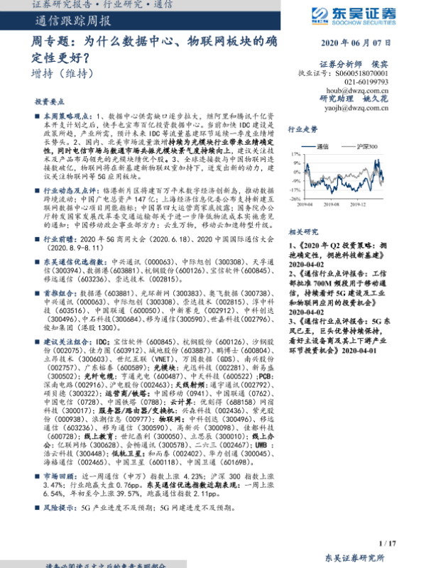 【东吴证券】【20200607】通信跟踪周报:为什么数据中心、物联网板块的确定性更好?-17页