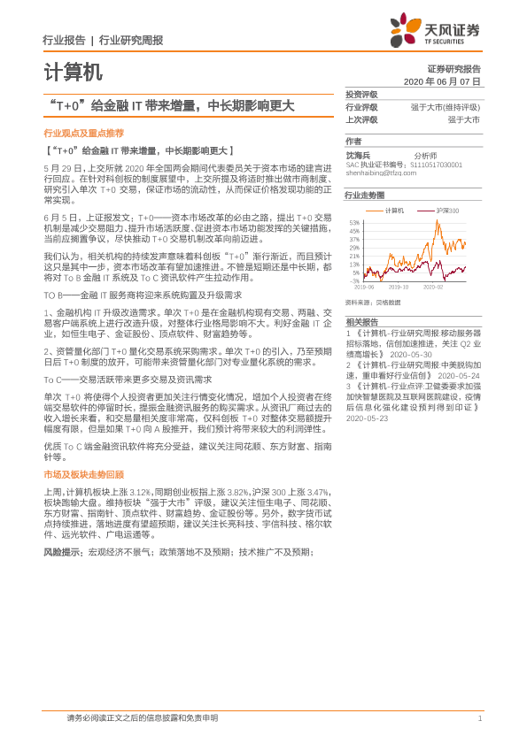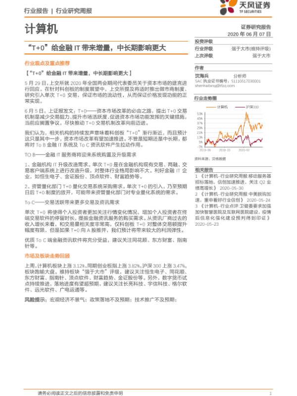 【天风证券】【20200607】20200607-天风证券-计算机行业研究周报:“T+0”给金融IT带来增量,中长期影响更大-9页