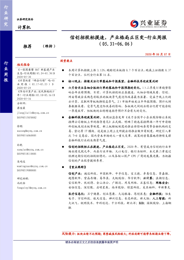 【兴业证券】【20200607】20200607-兴业证券-计算机行业周报:信创招投标提速,产业格局正巨变-25页