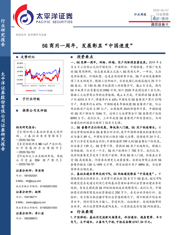 【太平洋证券】【20200607】20200607-太平洋-通信设备Ⅲ行业周报:5G商用一周年,发展彰显“中国速度”-15页