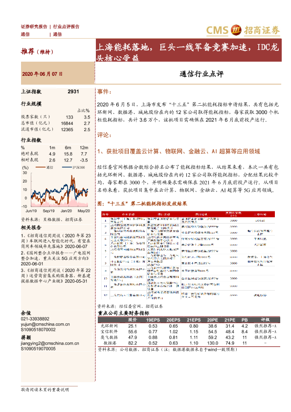 【海通证券】【20200607】通信行业点评:上海能耗落地,巨头一线军备竞赛加速,IDC龙头核心受益-4页