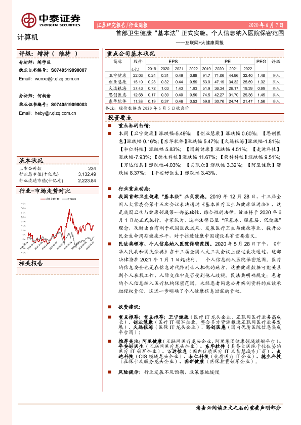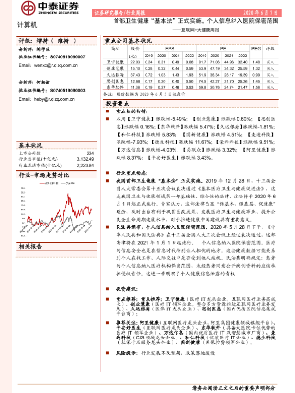 【中泰证券】【20200607】20200607-中泰证券-互联网+大健康周报:首部卫生健康“基本法”正式实施,个人信息纳入医院保密范围-9页