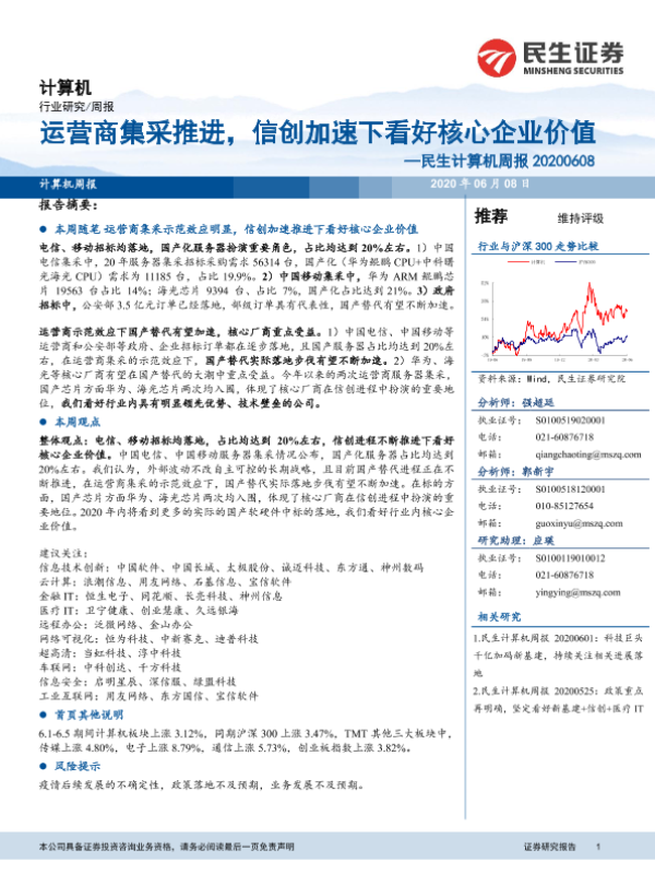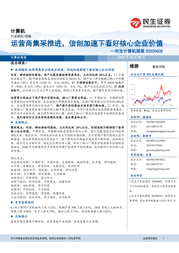【民生证券】【20200608】20200608-民生证券-计算机周报:运营商集采推进,信创加速下看好核心企业价值-17页