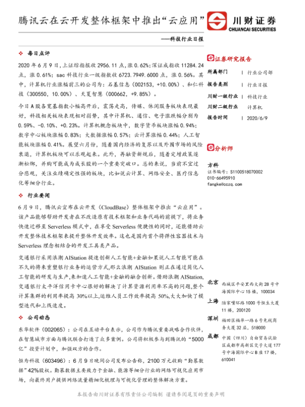 【川财证券】【20200609】科技行业日报:腾讯云在云开发整体框架中推出“云应用”-3页