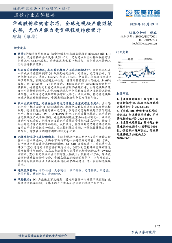 【东吴证券】【20200609】通信行业点评报告:华西股份收购索尔思,全球光模块产能继续东移,光芯片能力受重视程度持续提升-2页