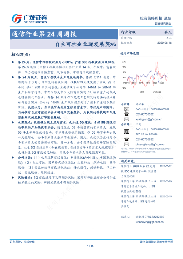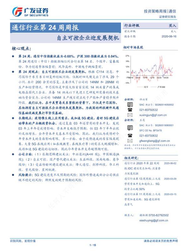 【广发证券】【20200616】通信行业第24周周报:自主可控企业迎发展契机-15页