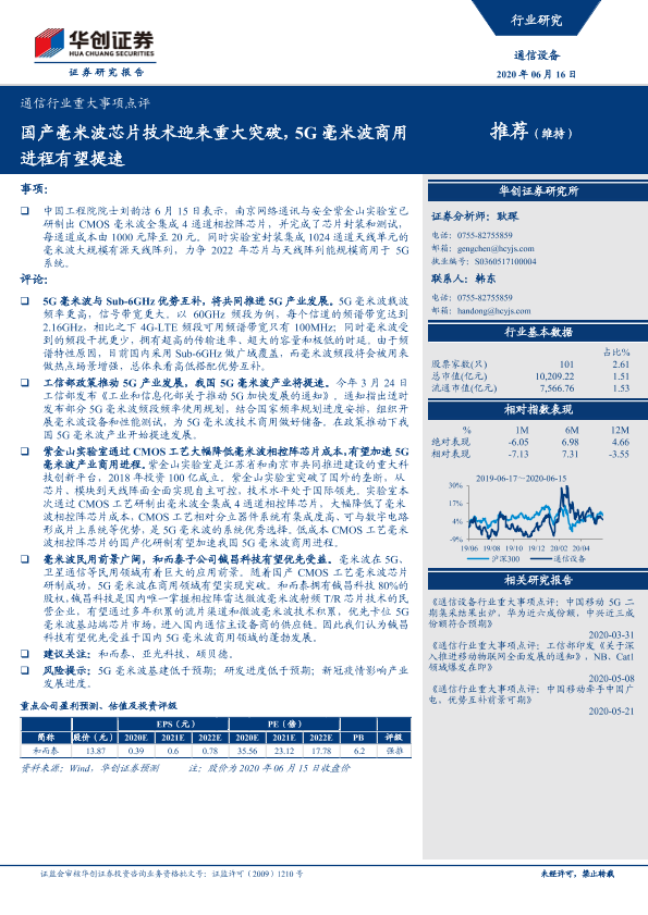 【华创证券】【20200616】通信行业重大事项点评:国产毫米波芯片技术迎来重大突破,5G毫米波商用进程有望提速-3页