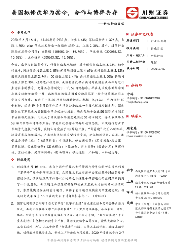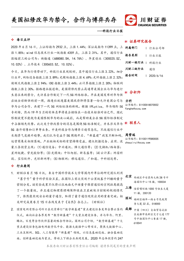 【川财证券】【20200616】科技行业日报:美国拟修改华为禁令,合作与博弈共存-4页