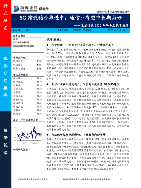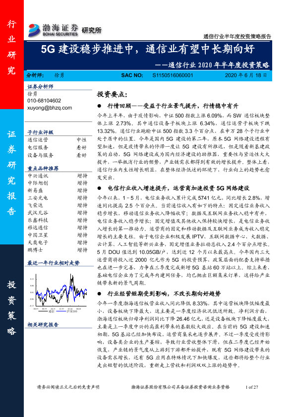 【渤海证券】【20200618】通信行业2020年半年度投资策略:5G建设稳步推进中,通信业有望中长期向好-27页
