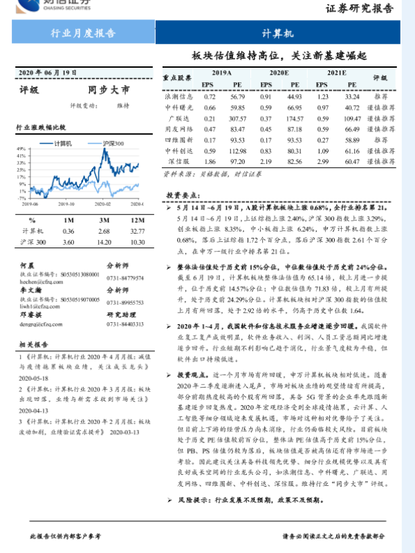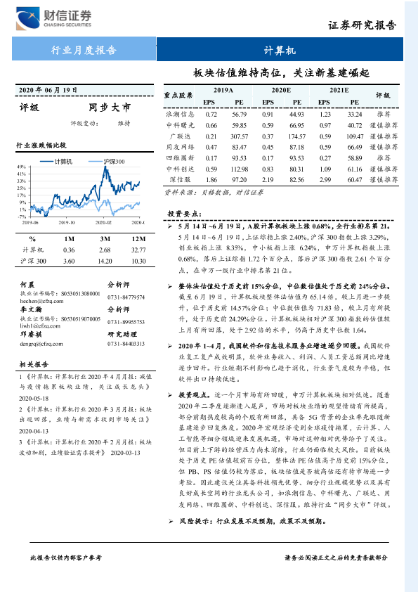 【财信证券】【20200619】计算机行业月度报告:板块估值维持高位,关注新基建崛起-11页