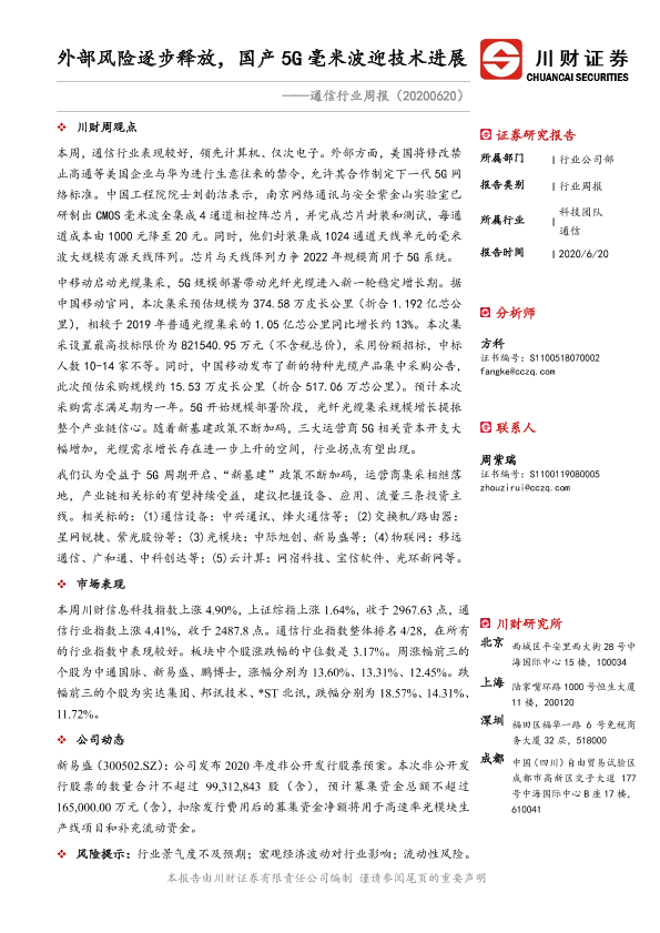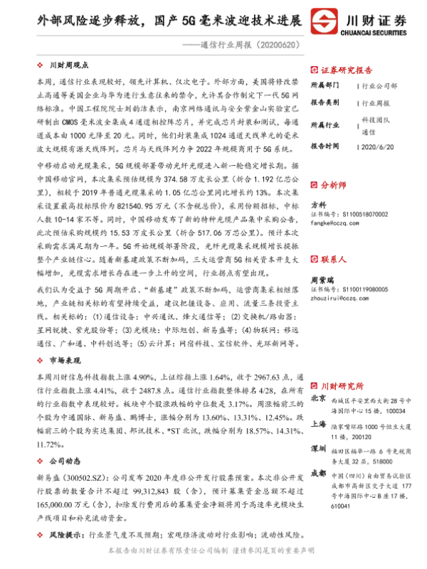 【川财证券】【20200620】通信行业周报:外部风险逐步释放,国产5G毫米波迎技术进展-11页