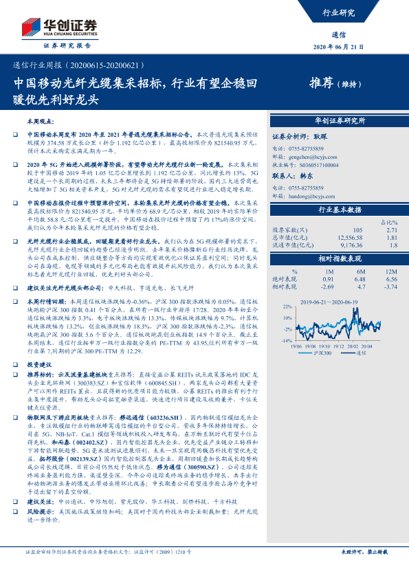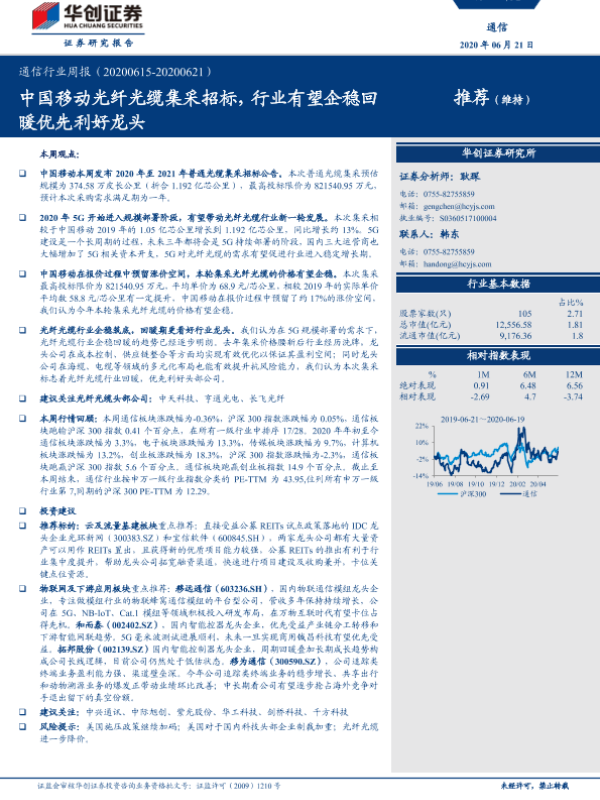 【华创证券】【20200621】20200621-华创证券-通信行业周报:中国移动光纤光缆集采招标,行业有望企稳回暖优先利好龙头-16页
