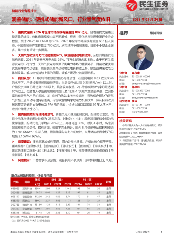 【民生证券】【20220926】储能行业专题报告:洞鉴储能,便携式储能新风口,行业景气度依旧-31页