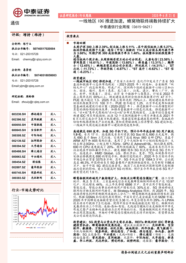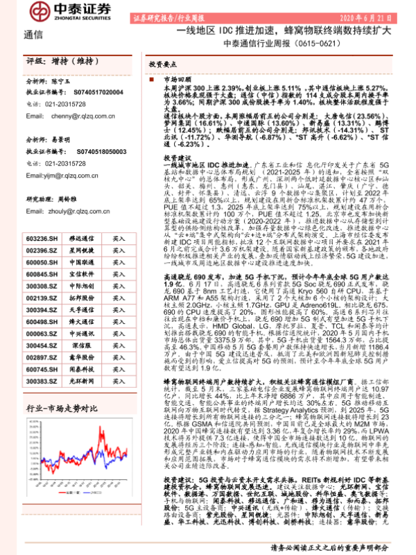 【中泰证券】【20200621】中泰通信行业周报:一线地区IDC推进加速,蜂窝物联终端数持续扩大-17页