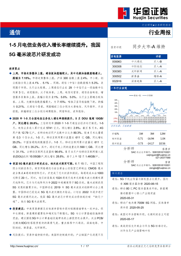 【华金证券】【20200622】20200622-华金证券-通信行业周报:1-5月电信业务收入增长率继续提升,我国5G毫米波芯片研发成功-17页