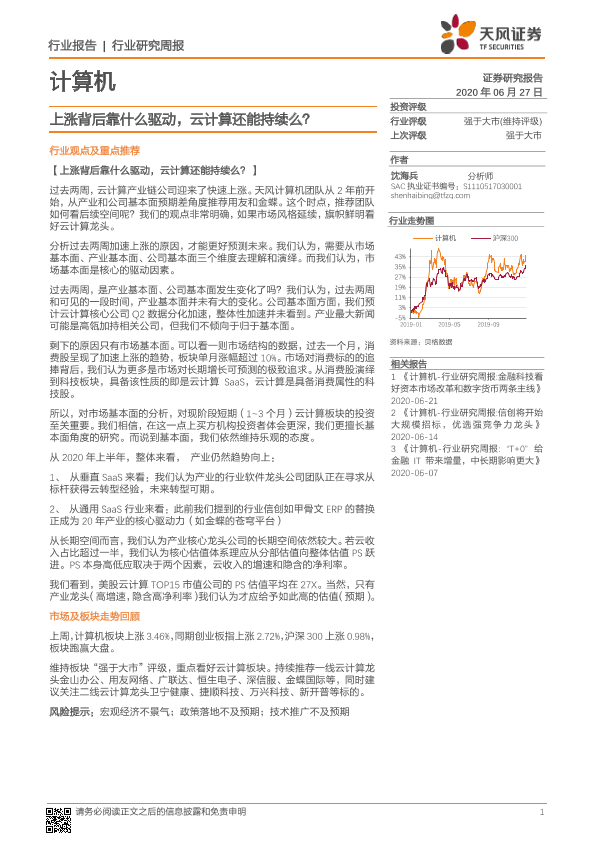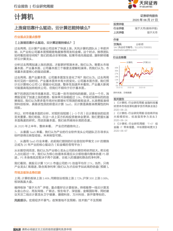 【天风证券】【20200627】20200627-天风证券-计算机行业研究周报:上涨背后靠什么驱动,云计算还能持续么?-10页