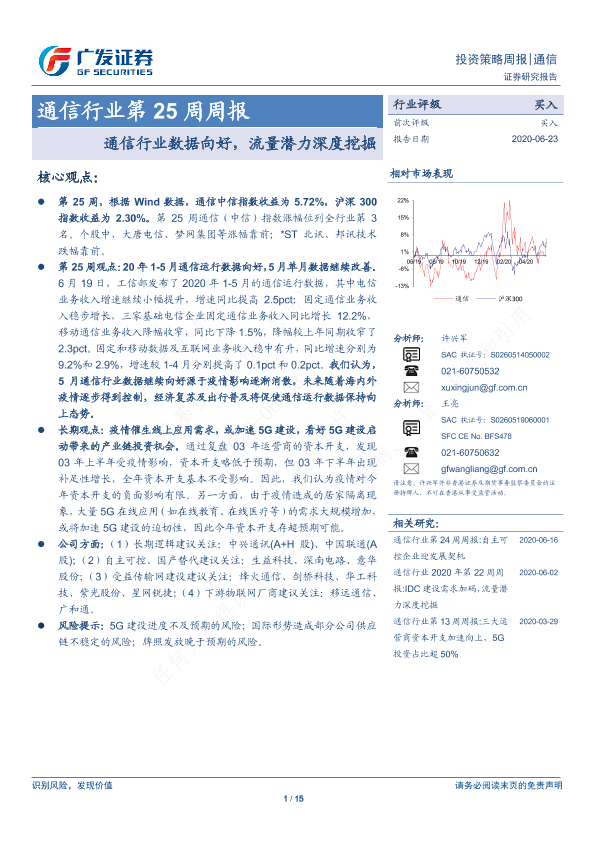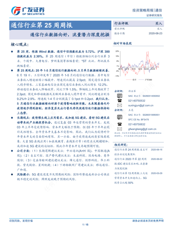 【广发证券】【20200623】通信行业第25周周报:通信行业数据向好,流量潜力深度挖掘-15页