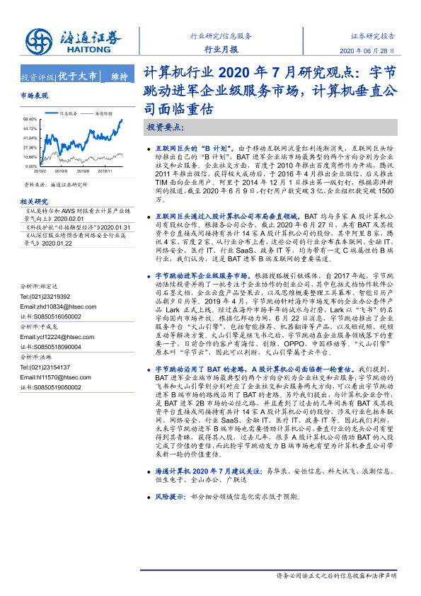 【海通证券】【20200628】计算机行业2020年7月研究观点:字节跳动进军企业级服务市场,计算机垂直公司面临重估-10页