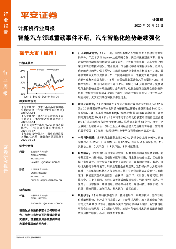 【平安证券】【20200628】计算机行业周报:智能汽车领域重磅事件不断,汽车智能化趋势继续强化-5页