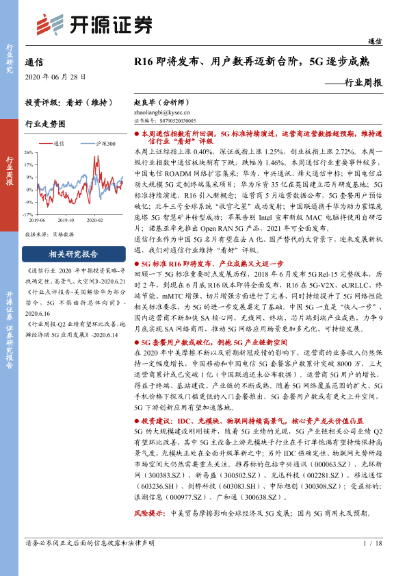 【开源证券】【20200628】通信行业周报:R16即将发布、用户数再迈新台阶,5G逐步成熟-18页