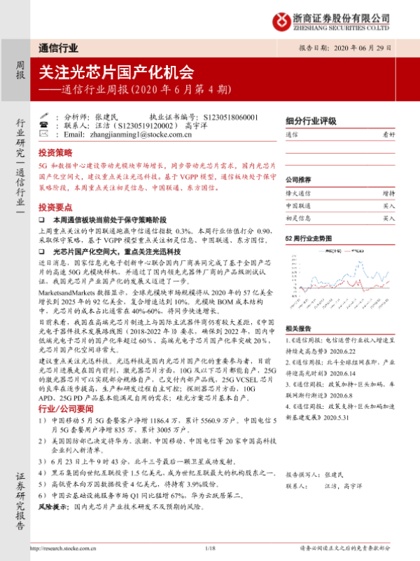 【浙商证券】【20200629】20200629-浙商证券-通信行业周报(2020年6月第4期):关注光芯片国产化机会-18页