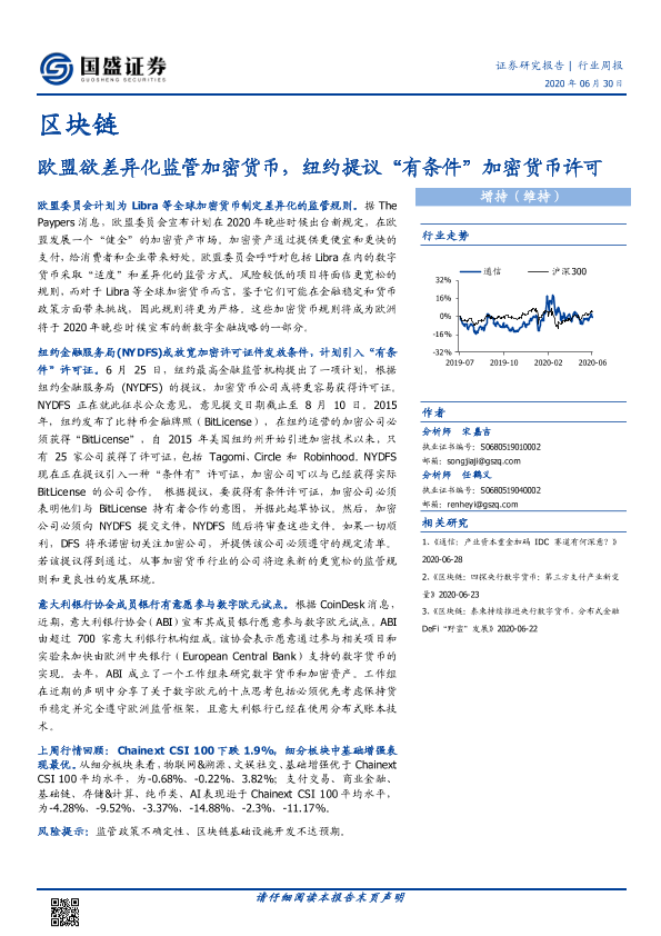 【国盛证券】【20200630】区块链行业周报:欧盟欲差异化监管加密货币,纽约提议“有条件”加密货币许可-9页