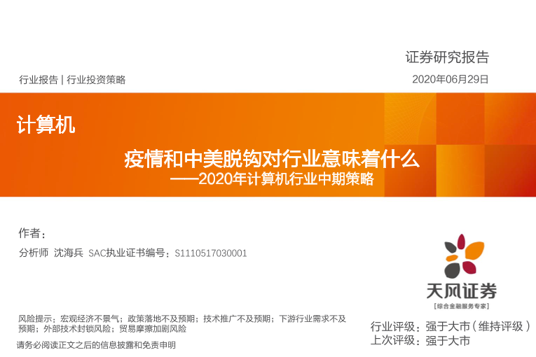 中美关系 投资策略 疫情影响 计算机行业 风险提示
