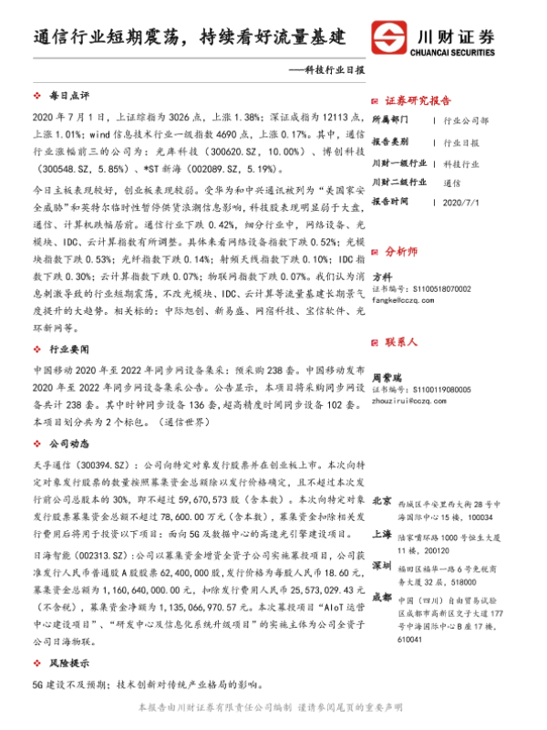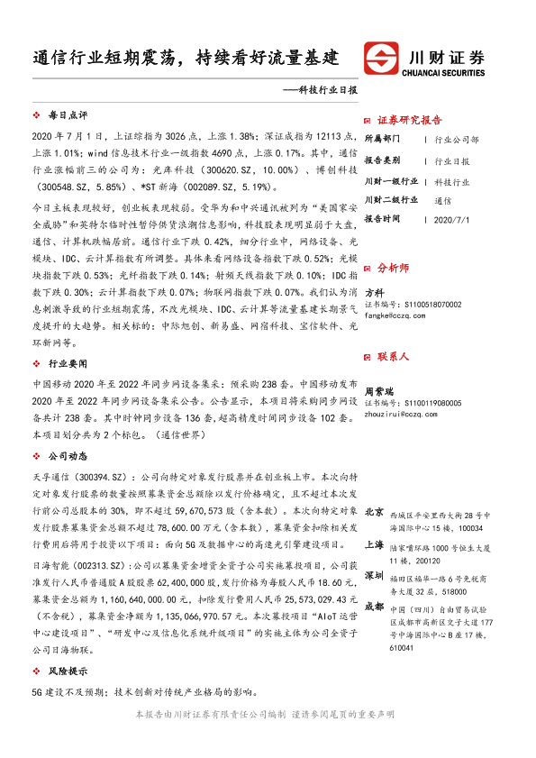 【川财证券】【20200701】科技行业日报:通信行业短期震荡,持续看好流量基建-4页