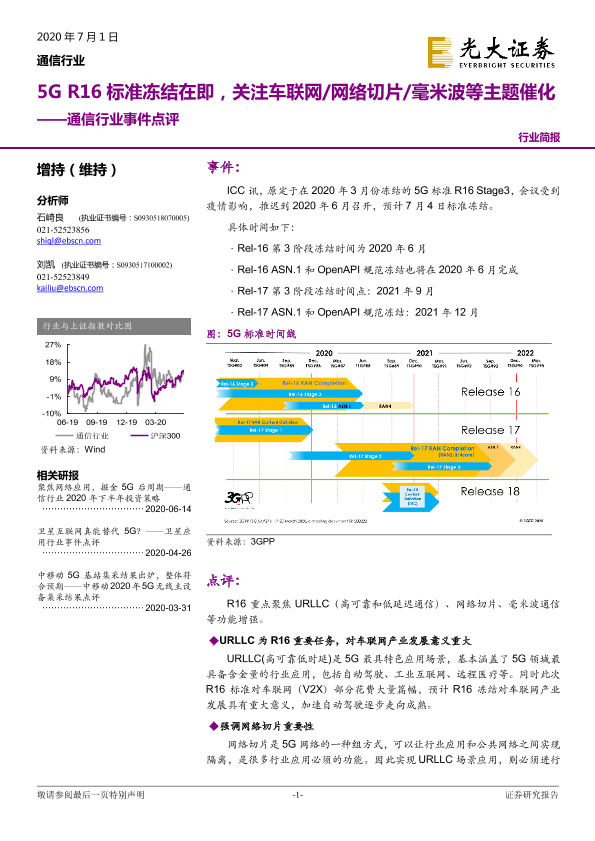 【光大证券】【20200701】通信行业事件点评:5G R16标准冻结在即,关注车联网 网络切片 毫米波等主题催化-3页