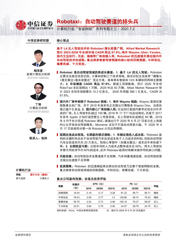 【中信证券】【20200702】计算机行业“智能网联”系列专题之三:Robotaxi:自动驾驶赛道的排头兵-16页