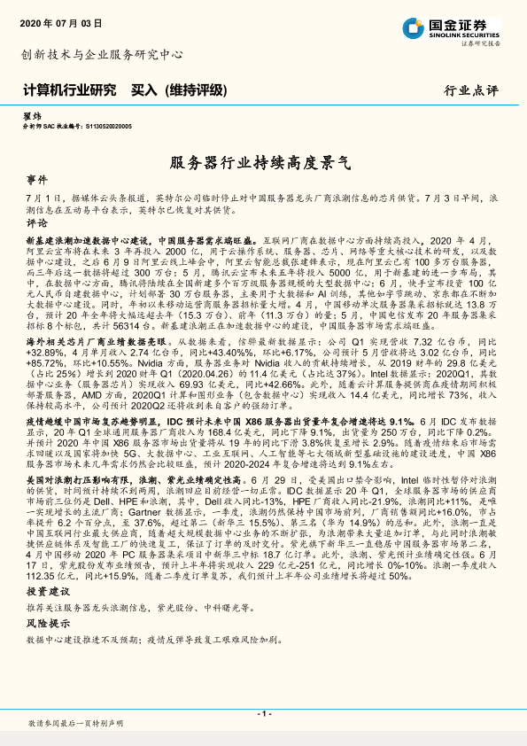 【国金证券】【20200703】计算机行业研究:服务器行业持续高度景气-4页