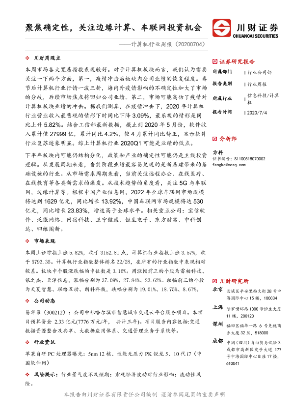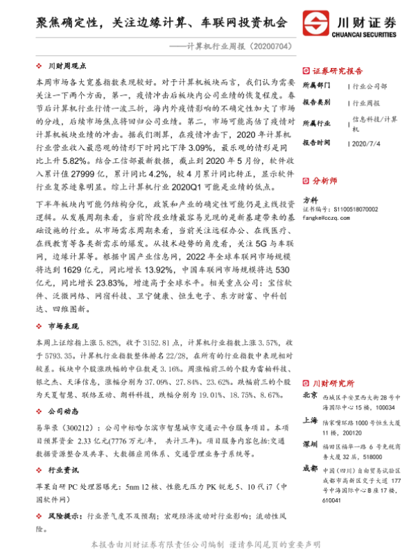 【川财证券】【20200704】20200704-川财证券-计算机行业周报:聚焦确定性,关注边缘计算、车联网投资机会-8页