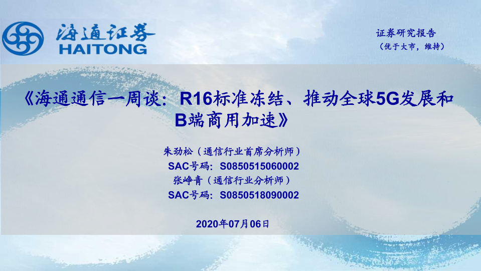 【海通证券】【20200706】海通通信一周谈:R16标准冻结、推动全球5G发展和B端商用加速-10页