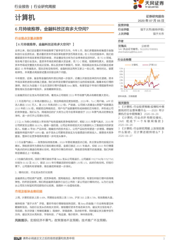 【天风证券】【20200706】计算机行业研究周报:6月持续推荐,金融科技还有多大空间?-10页