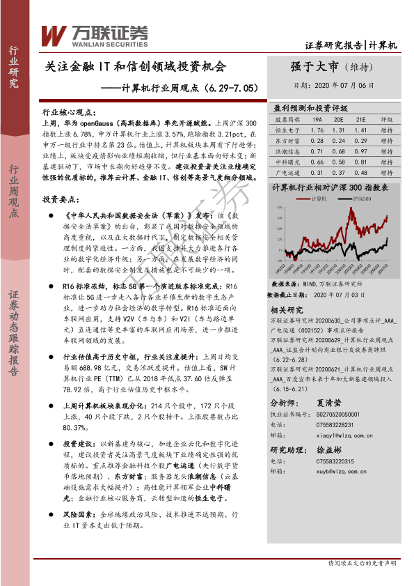 【万联证券】【20200706】计算机行业周观点:关注金融IT和信创领域投资机会-15页