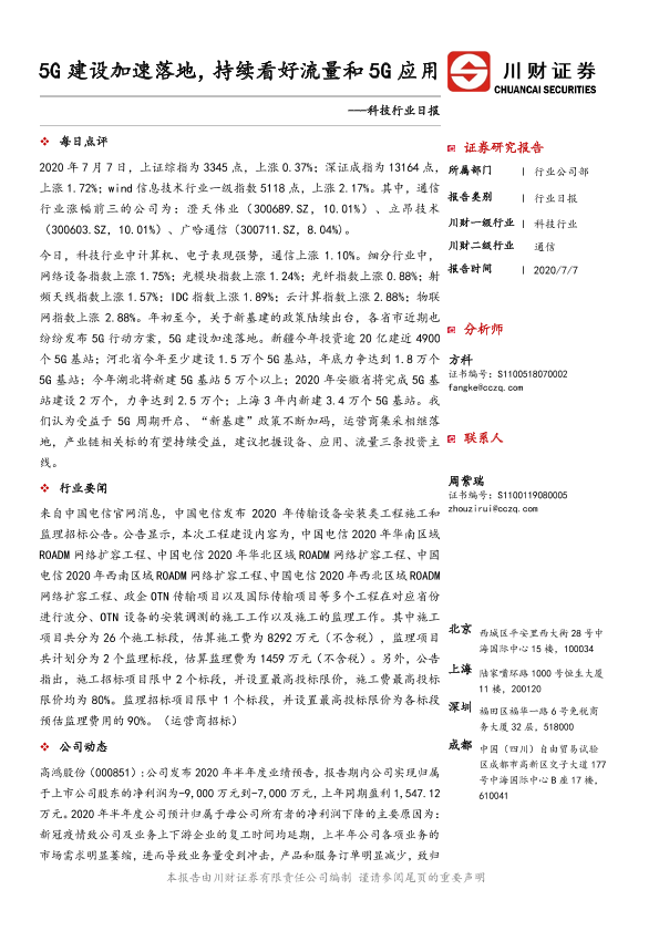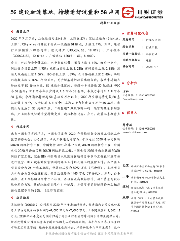 【川财证券】【20200707】科技行业日报:5G建设加速落地,持续看好流量和5G应用-4页