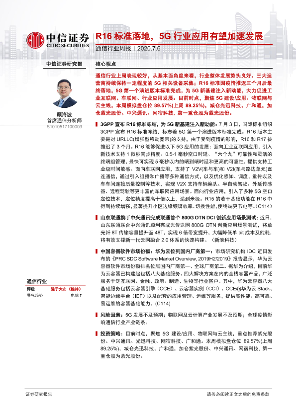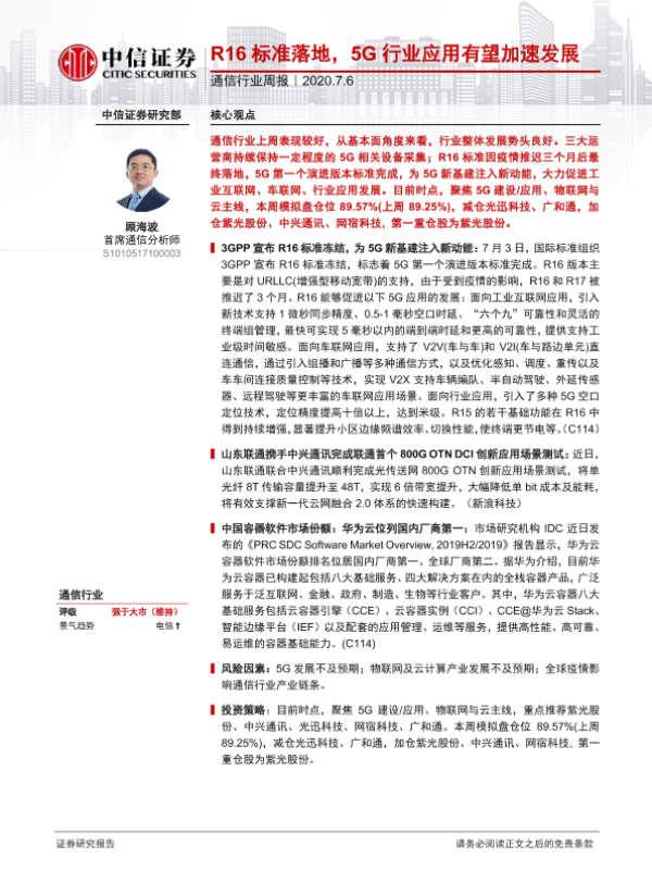 【中信证券】【20200706】通信行业周报:R16标准落地,5G行业应用有望加速发展-9页