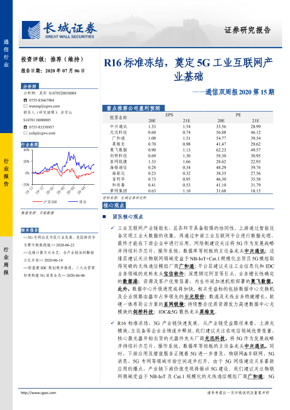 【长城证券】【20200706】通信双周报2020第15期:R16标准冻结,奠定5G工业互联网产业基础-38页