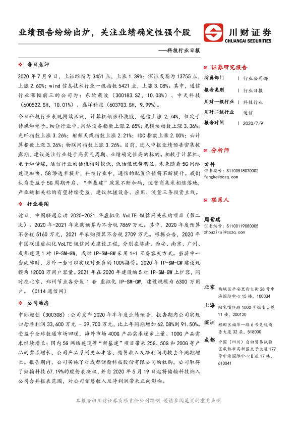 【川财证券】【20200709】科技行业日报:业绩预告纷纷出炉,关注业绩确定性强个股-4页