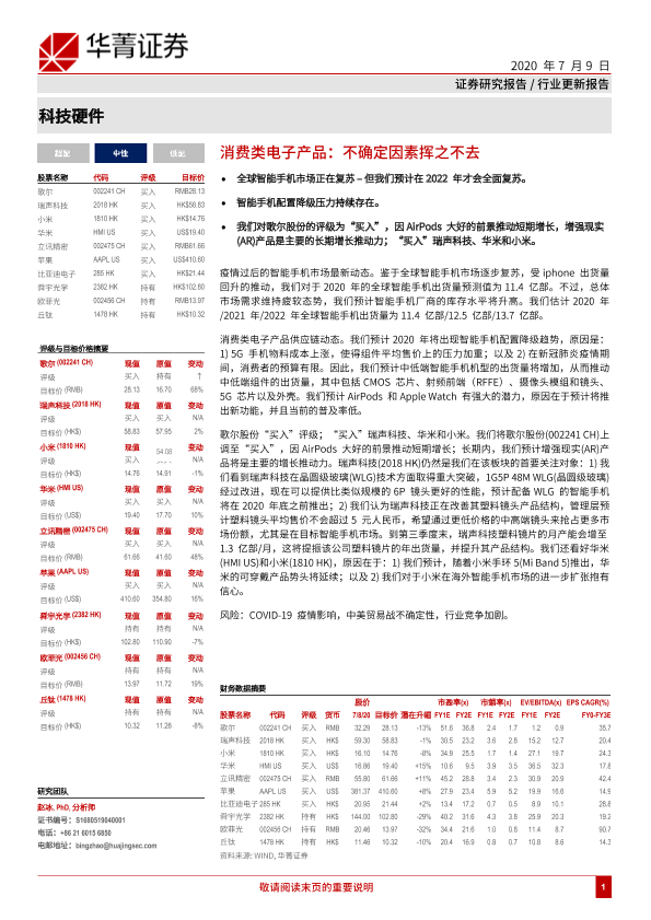 【华兴证券】【20200709】科技硬件行业更新报告:消费类电子产品:不确定因素挥之不去-25页